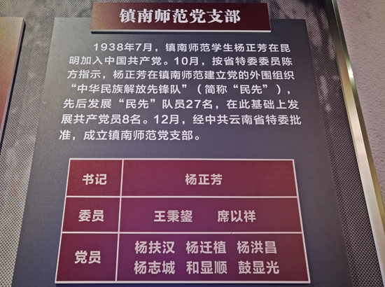 “抗日烽火”篇章中醒目地陈列着楚雄历史上最早的党支部之一——镇南师范党支部,为培养输送革命火种、发展壮大革命力量作出的积极贡献。激励着同志们发扬红色传统、传承红色基因,赓续共产党人的精神血脉。