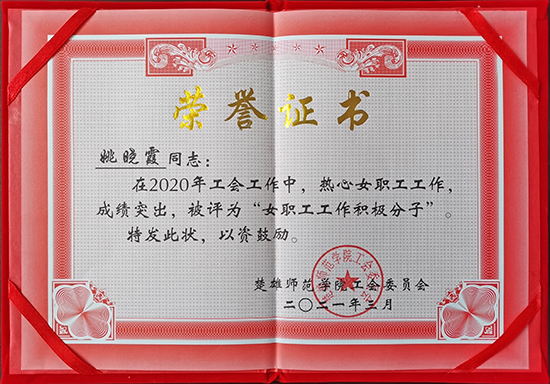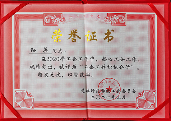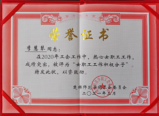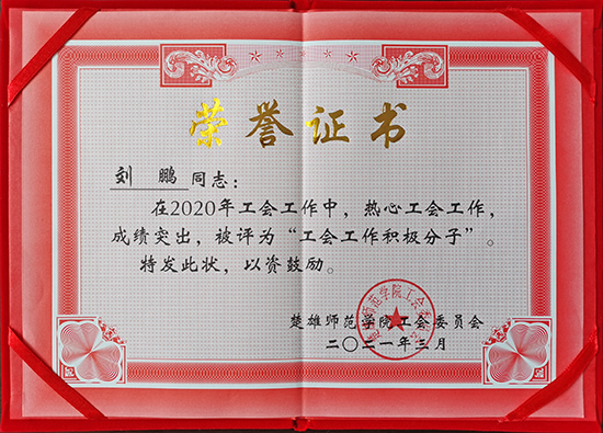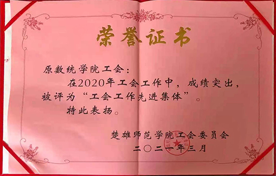 在3月28日召开的楚雄师范学院六届二次教职工暨工会会员代表大会上,原数统学院工会、信息学院工会在2020年的工作中成绩突出,被评为“工会工作先进集体”受到学校表彰奖励,刘鹏、孙英两位老师热心工会工作,被评为“工会工作积极分子”,姚晓霞、李慧琴两位老师积极开展女工工作,被评为“女职工工作积极分子”受到学校表彰。