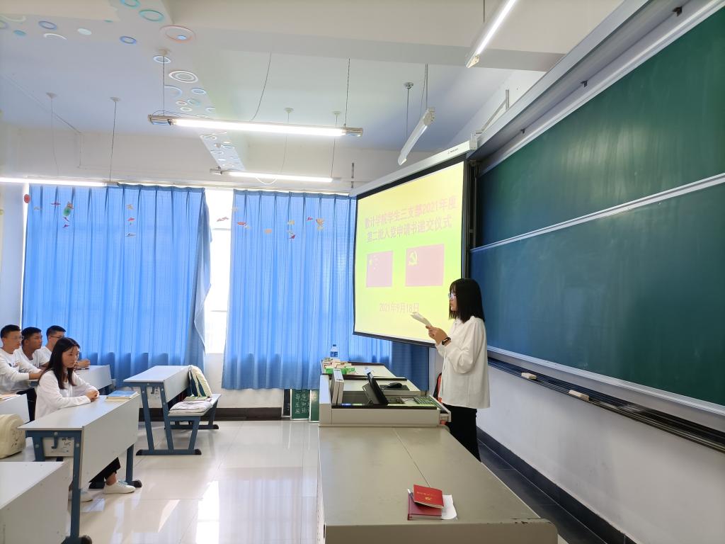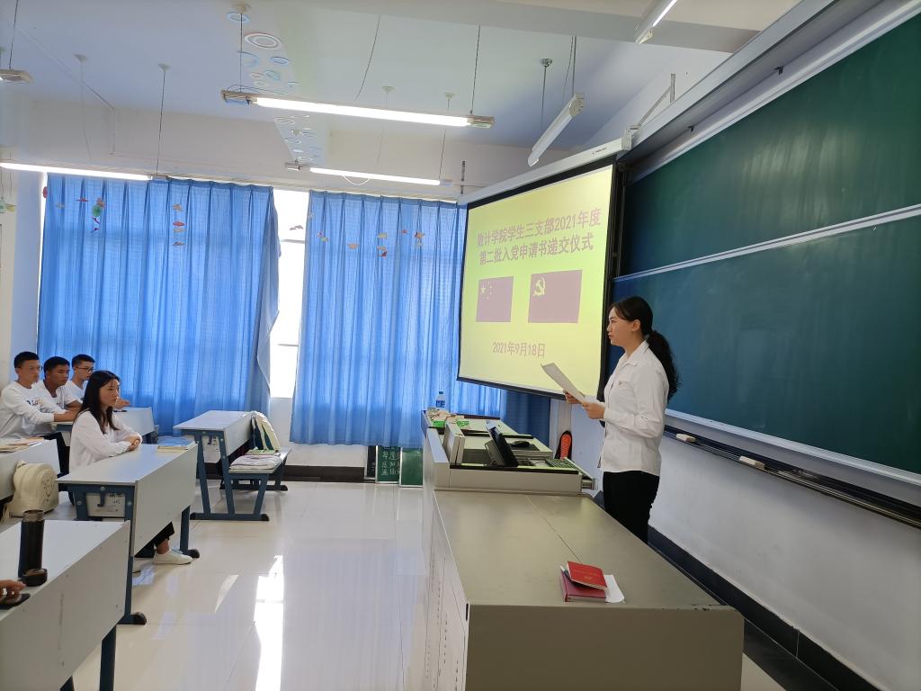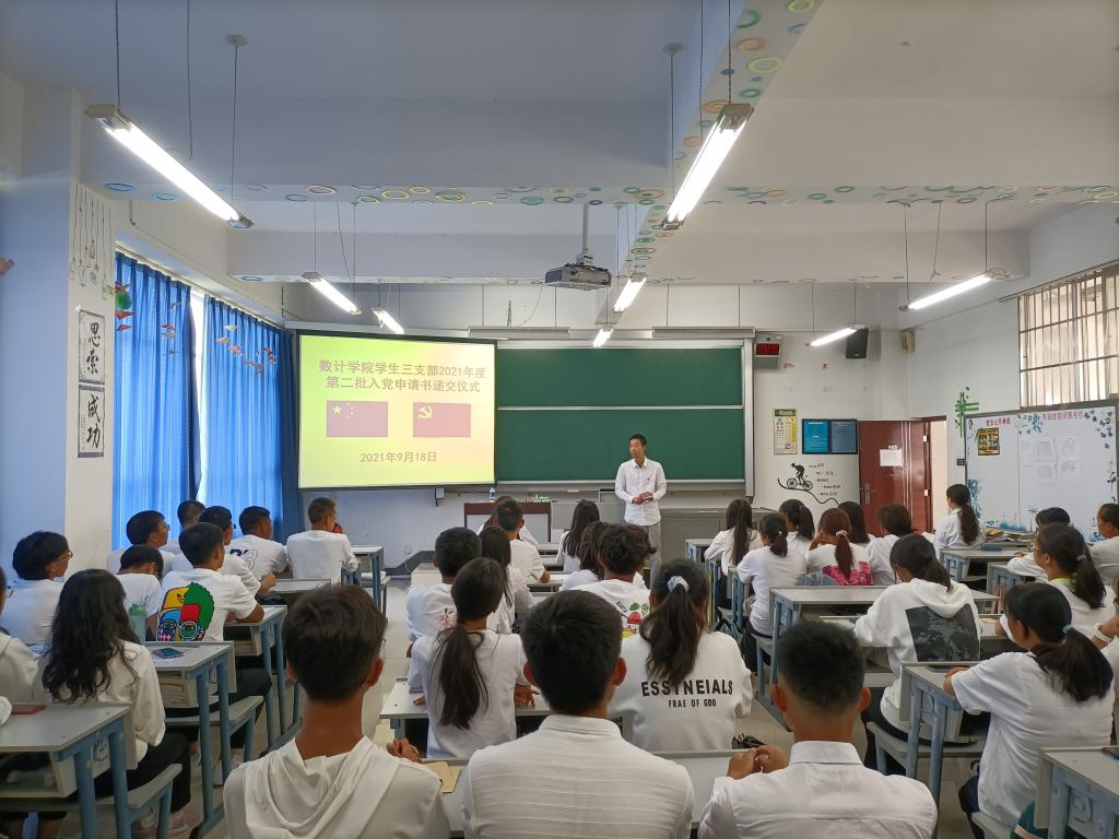 9月18日,数计学院学生第三党支部在明德楼405室,举行2021级新同学入党申请书递交仪式,学生第三党支部书记郭舟,支委李海双、金正楠,党支部全体在校党员以及59名准备递交入党申请书的2021级应用统计学专业新生参加,仪式由田艺娟同志主持。