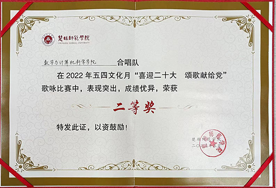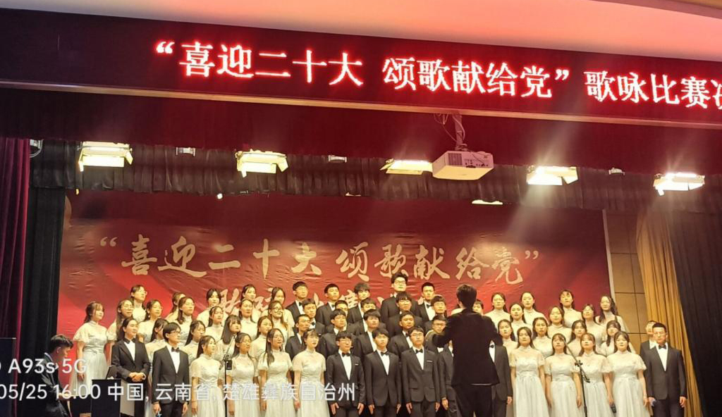 为进一步激发广大师生爱党爱国热情,更加坚定永远跟党走的理想信念,以优异成绩迎接党的二十大胜利召开,楚雄师范学院于2022年5月25日下午15:00在雁塔校区上礼堂举办了“喜迎二十大 颂歌献给党”歌咏比赛。此次比赛中,数计学院取得二等奖的优异成绩。