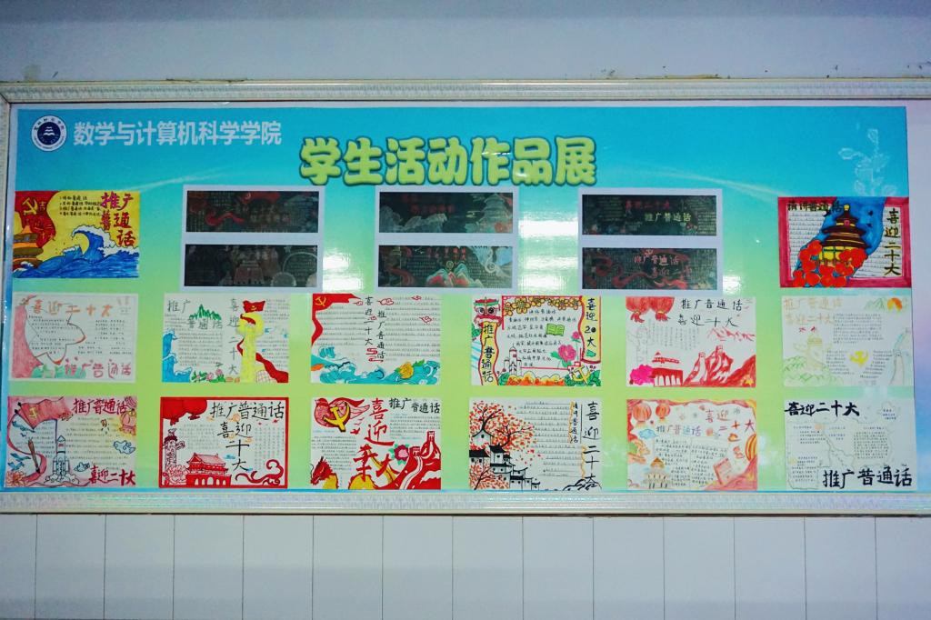 喜迎二十大,永远跟党走,奋进新征程。为贯彻落实全国语言文字会议精神,加大国家通用语言文字推广力度,9月22日,学院开展了“推广普通话,献礼二十大”主题活动,以黑板报、手抄报的形式充分宣传了活动精神。此外,学院还圆满举办了“喜迎二十大,学习向未来”主题征文大赛、“喜迎二十大,绘画新风采”绘画大赛、“笔墨书香展风采,齐心喜迎二十大”钢笔字毛笔字书法大赛、告白祖国贺卡征集大赛等活动。同学们以笔为旗,笔力劲挺,挥斥方遒,将青春之我与奋斗之姿展现淋漓尽致,各项活动的优秀作品依次在笃学楼、明德楼展出,作品主题鲜明,精彩纷呈,共同献礼党的二十大。