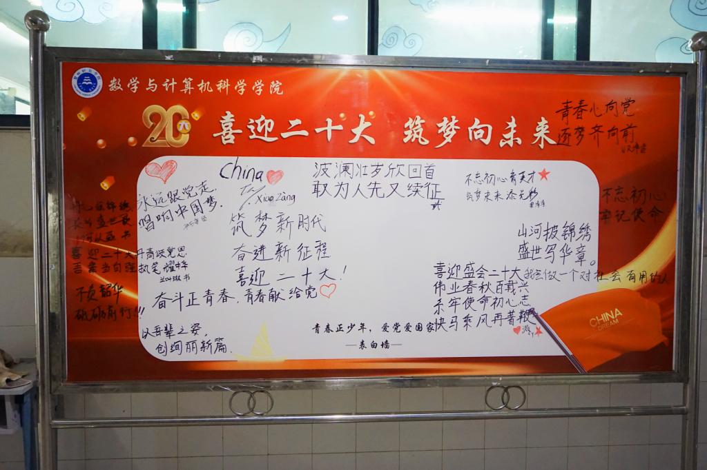 在党的二十大即将胜利召开之际,为引领广大青年听党话跟党走,以实际行动和优异成绩迎接党的二十大胜利召开,9月20日至10月15日期间,数计学院团委学生会举行了“喜迎二十大”系列活动,营造热情浓厚的氛围迎接党的二十大。在学院党委的领导下,各项活动稳步推进,团委学生会成员把每一个活动、每一项任务落实到位,全院同学积极参加,融入迎接党的二十大的热潮,将对党的告白书写在文字中,绘制在画作里。