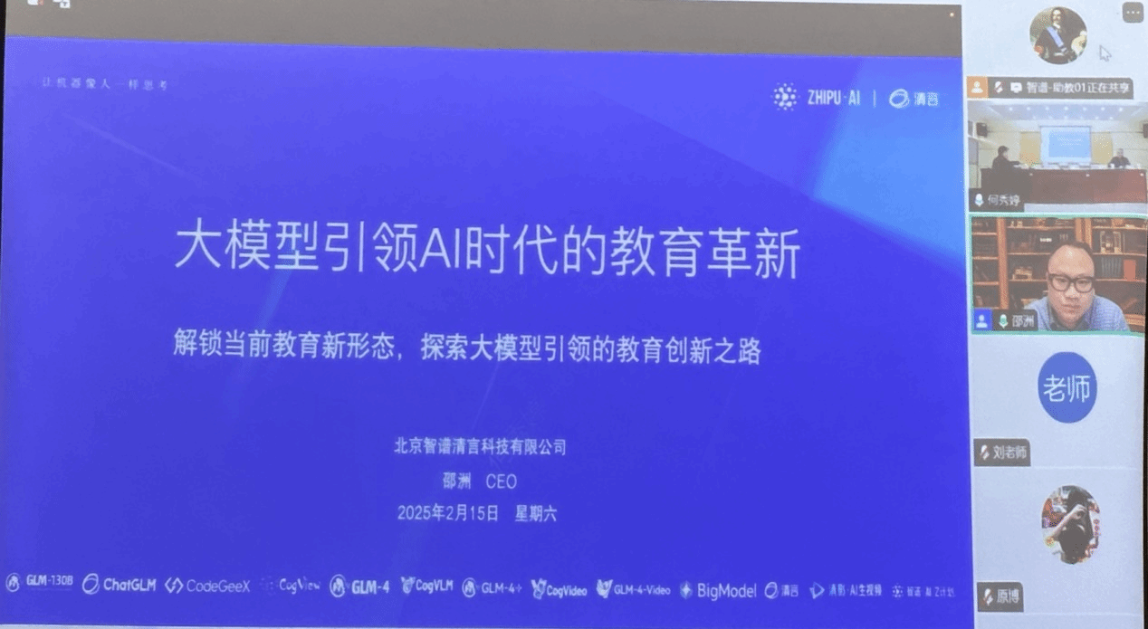 为积极响应国家教育数字化战略行动,促进人工智能与教育教学深度融合,提升教师数字化素养与技能,推动人工智能专业建设和大学信息技术课程教育教学改革,2月15日上午,在信息楼第二报告厅,我校与北京智谱清言科技有限公司、普天和平科技有限公司合作举办了人工智能师资第一期集中培训开班仪式。北京智谱清言科技有限公司CEO邵洲、普天新职教公司总经理王文婷线上参会并致辞,普天新职教公司产业学院运营总监何秀婷、学校副校长彭燕梅出席开班仪式,数学与计算机科学学院院长王志刚、副书记杨段生和教务处、人事处、数计学院负责人及参训教师60余人参加了开班仪式,会议由王志刚院长主持。