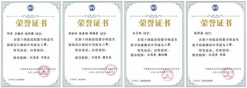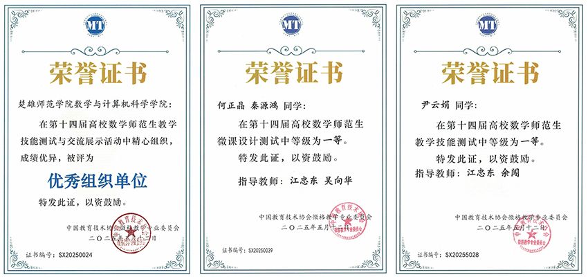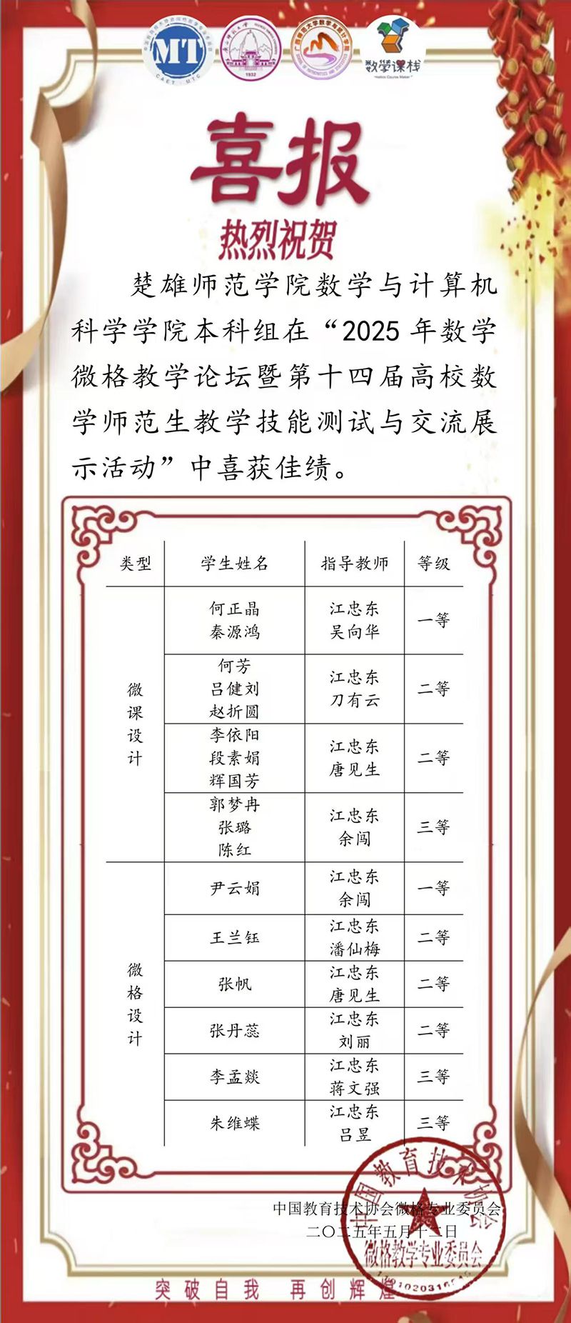 5月9日至12日,2025年第十四届全国高校数学师范生教学技能测试与交流展示活动在广西师范大学举行。我校数学与计算机科学学院派出了4个微课设计能力测试团队和6名微格教学技能测试选手参赛,全部获奖,并取得历史最好成绩。其中微课设计能力测试团队获得一等奖1项、二等奖2项、三等奖1项,微格教学技能测试选手获得一等奖1项、二等奖3项、三等奖2项。同时,数学与计算机科学学院获得“优秀组织单位奖”。