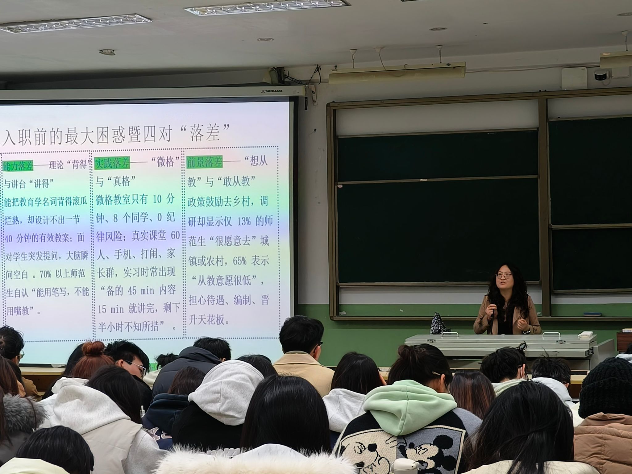 数学与统计学院积极开展学生指导服务,健全完善学生成长增值机制,提升学生职业发展能力。2025年11月19日,学院开展“学生职业发展”专题讲座,特邀楚雄州民族中学郭世婷老师、北浦中学徐宝玉老师主讲,数学与应用数学专业2023级、2024级全体学生参加讲座。