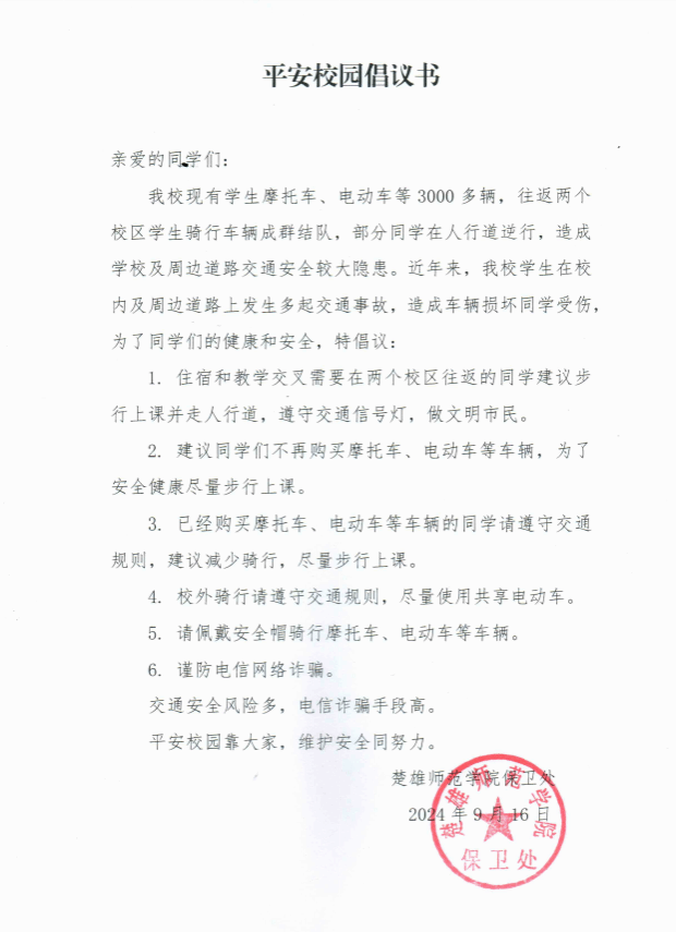 交通安全风险多,电信诈骗手段多。平安校园靠大家,维护安全同努力。
