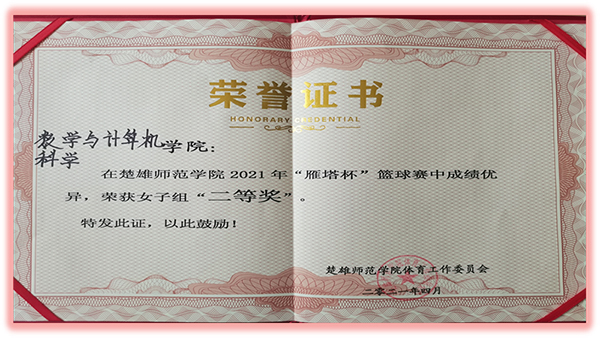 雁塔杯是楚师的一个重要的运动项目,设有篮球,排球,足球三项运动项目,篮球赛由4月7号开始到4月18号止,赛程制度是各学院与学院之间的对决赛,当然,亦是联谊赛。经过多天的比赛。数计学院有两支队伍一路披荆斩棘,打进总决赛,在最后与管理与经济学院的对决中胜出,篮球男子队和女子队都分别取得了第二名的好成绩。球场上的汗水是青春的写照,最后的成绩是球员们拼搏的见证。