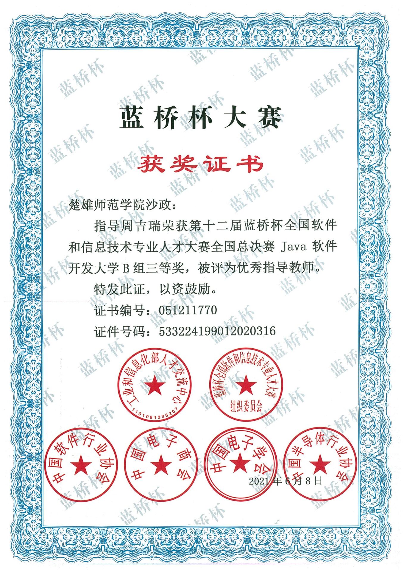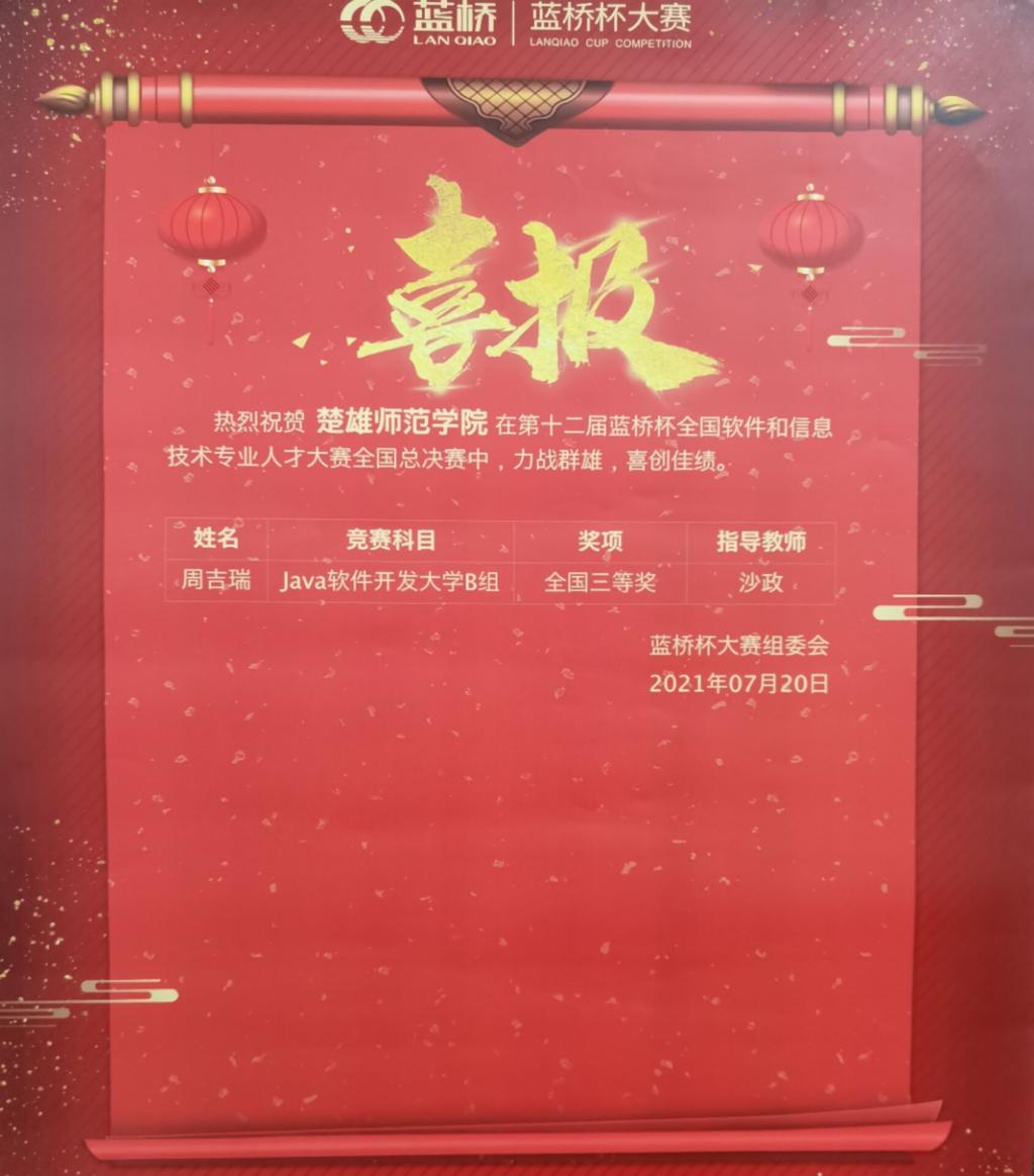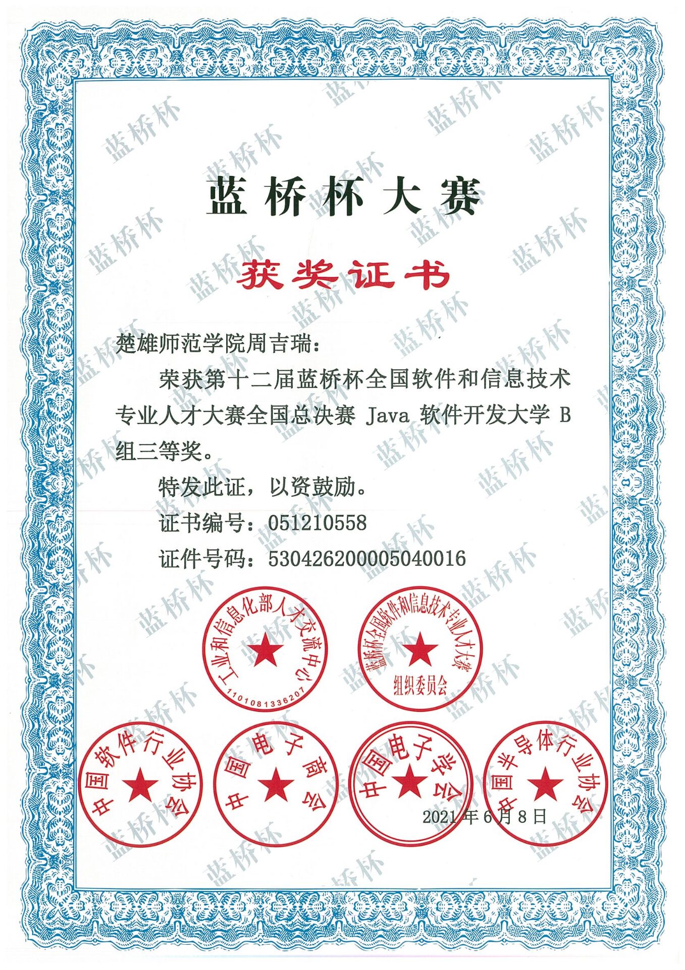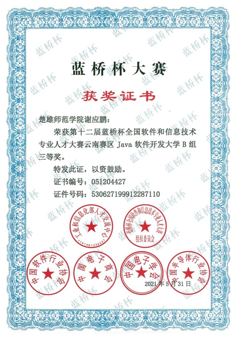 本次大赛由国家工业和信息化部人才交流中心主办,在全国各省设赛区,面向全国高新研究生、本科生、专科学生。我院学生积极参与,在报名后的五个月内,经过层层选拔,最后我院计算机科学与技术专业周吉瑞同学、谢应鹏同学于同年4月成功进组并通过认真地分析赛事、用心地赛前筹备,最后分别荣获“蓝桥杯竞赛”云南省赛区Java软化开发大学B组一等奖和三等奖。此外,据赛事安排,获省一等奖者可直接进入国赛,由此,我校周吉瑞同学愈战愈勇,于同年5月顺利进行了全国总决赛,并在比赛过程中,乘风破浪、不服众望所归,荣获全国三等奖,喜创佳绩。