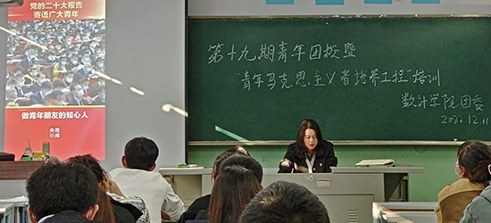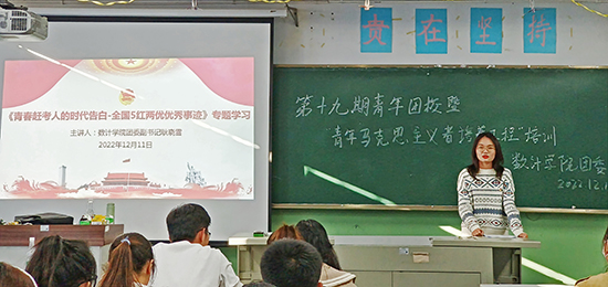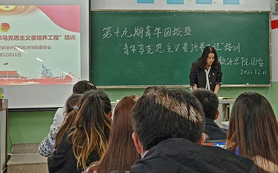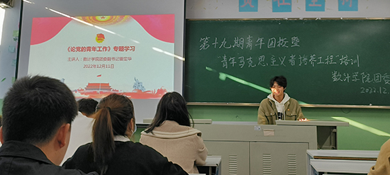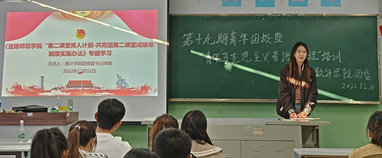 为深入学习宣传贯彻习近平新时代中国特色社会主义思想,深刻领悟党的二十大精神,贯彻落实“青年马克思主义者培养工程”,加强团员青年的培养教育,根据《楚雄师范学院第十九期青年团校暨“青年马克思主义者培养工程”培训实施方案》通知要求,我院于12月11日开展了2022年青年团校暨“青年马克思主义者培养工程”培训活动,学院团委书记赵治红、团委专兼职副书记曾定华、余刘明、张敏、耿晓雪依次进行了专题领学,学院团委学生会干部、各班级团支部委员参加培训。