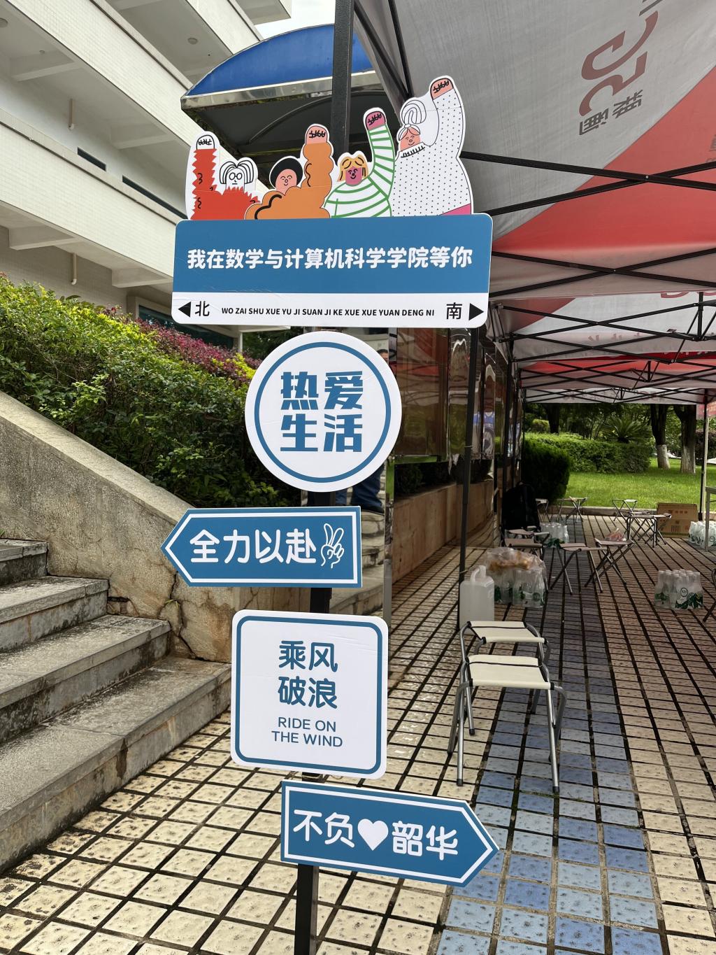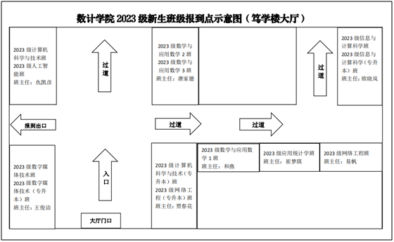 在入校通道处将有学长学姐志愿者迎接新同学,并指引新同学至数计学院接待点,由接待点的学长学姐为新同学安排志愿者一对一接待,指引新同学至数计学院报到点(笃学楼大厅)。