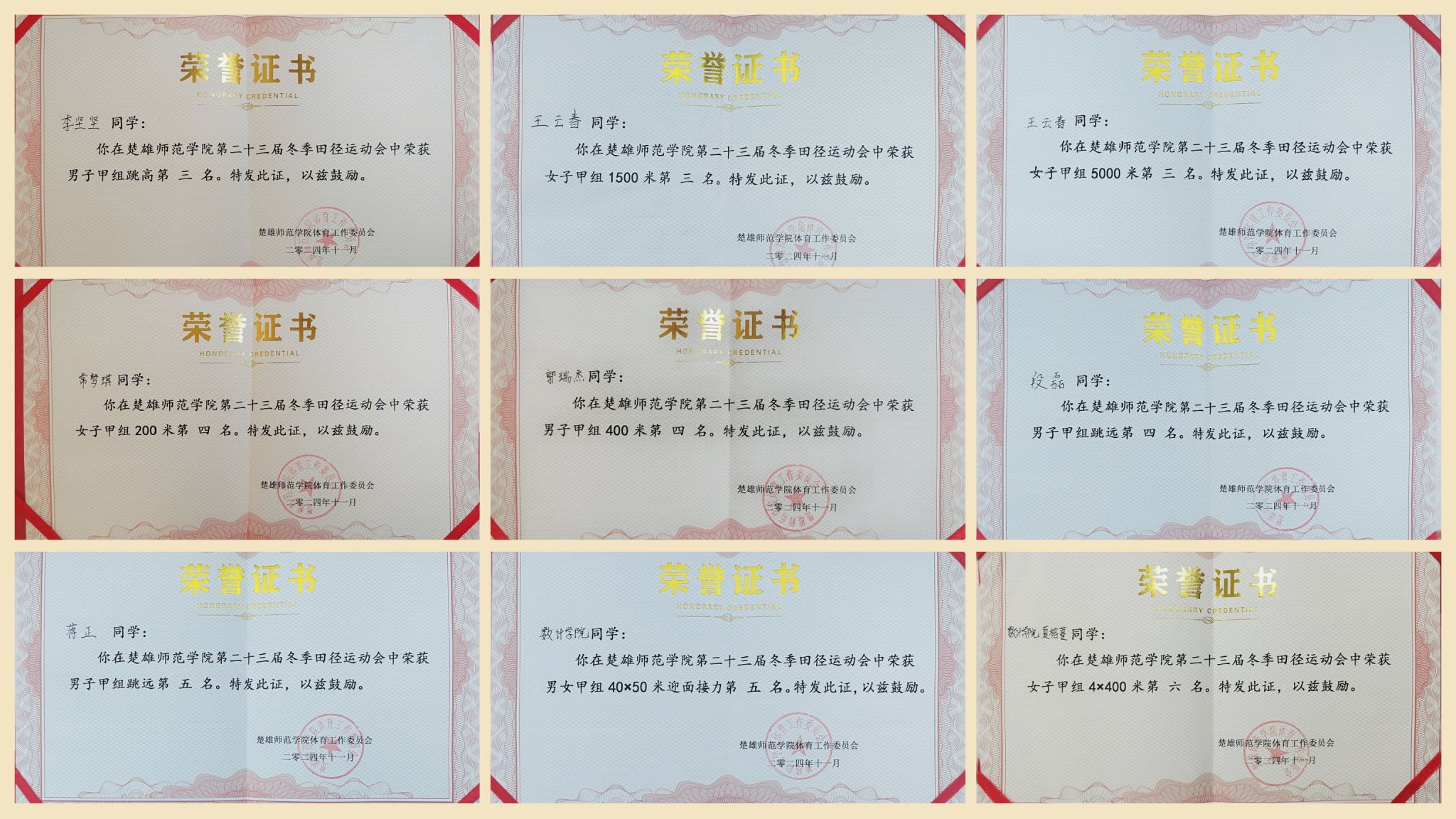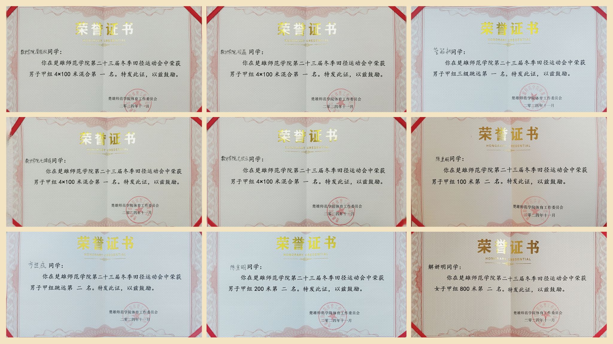 历经三日鏖战,我院运动健儿佳绩频传。在团体操、啦啦操两项集体项目中,分别荣获第一名和第三名。在4×100米团体赛中,我院学子默契配合,顽强拼搏,勇夺团体第一名,2023级数学与应用数学1班管能权斩获男子三级跳远项目第一名,陈金明赢得男子100米及200米项目第二名,2023级数学与应用数学2班解妍明荣获女子800米项目第二名。我院运动健儿们在各项目中表现卓越,尽显青春活力与团结协作精神,最终,我院荣获运动会团体总分第三名。