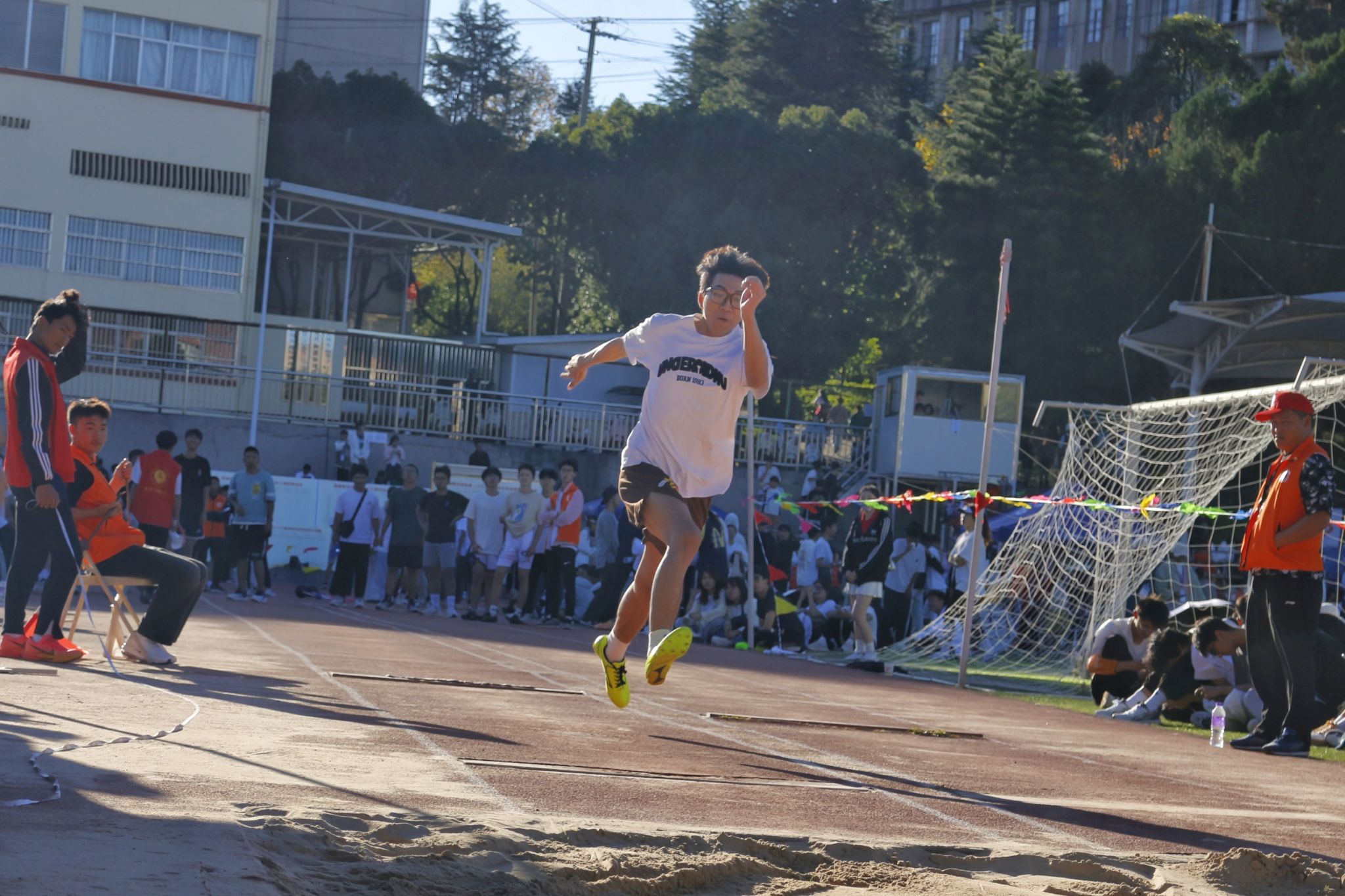赛场上,运动健儿们斗志昂扬,奋勇拼搏。田径赛中,100米、200米短跑等项目有序展开,运动员们如离弦之箭冲向终点。跳远比赛现场气氛热烈,运动员助跑、踏条、腾空、落地,在空中划过完美弧线,恰似矫健的飞燕稳落沙坑。
