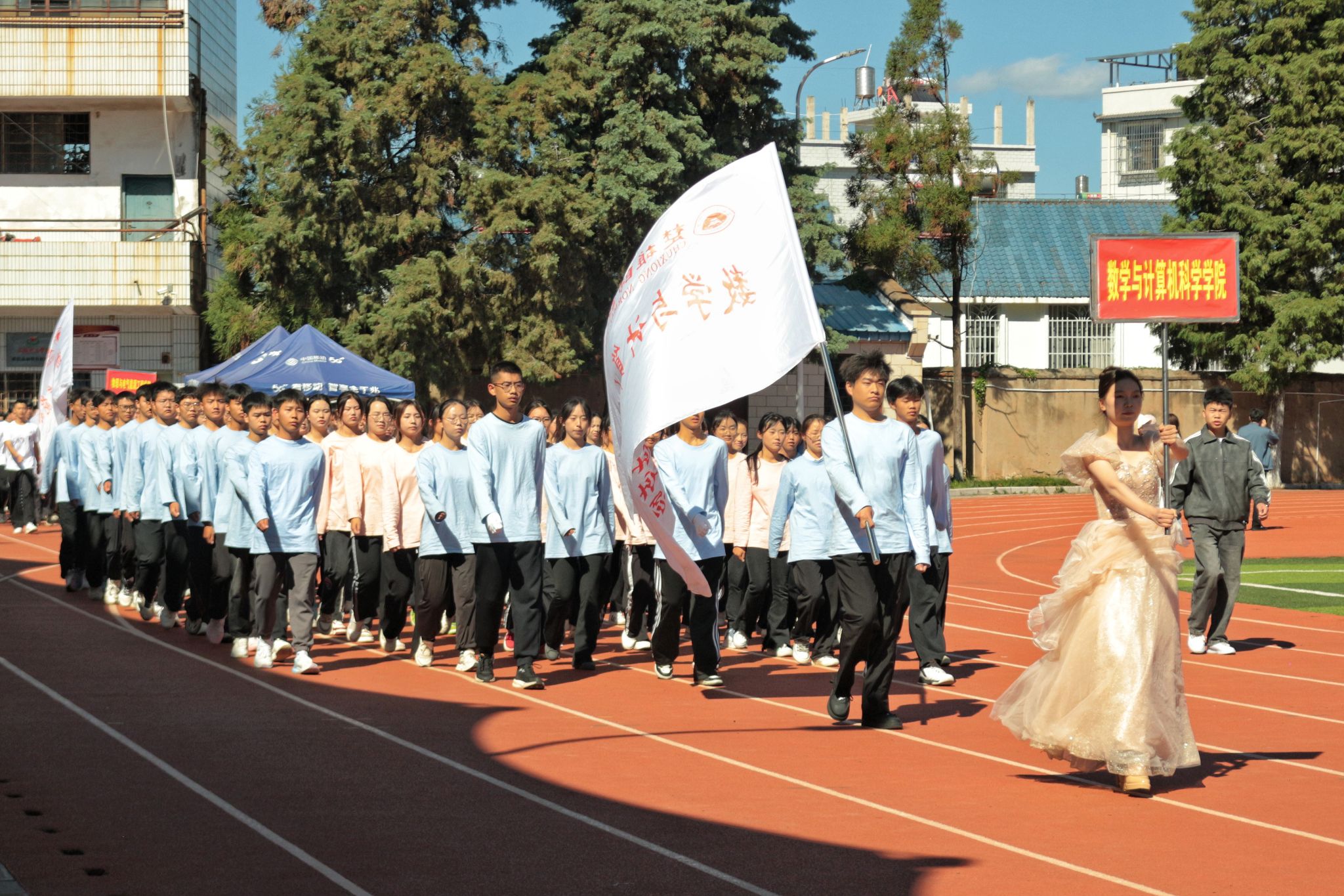汗水绘就青春画卷,拼搏奏响成长乐章,我校第二十三届运动会于11月13日至11月15日在雁塔校区田径场隆重举行。运动会在《运动员进行曲》的铿锵旋律中逐渐拉开序幕,我院运动员代表方队迈着矫健的步伐,昂首阔步,意气风发,展示着他们的蓬勃朝气。