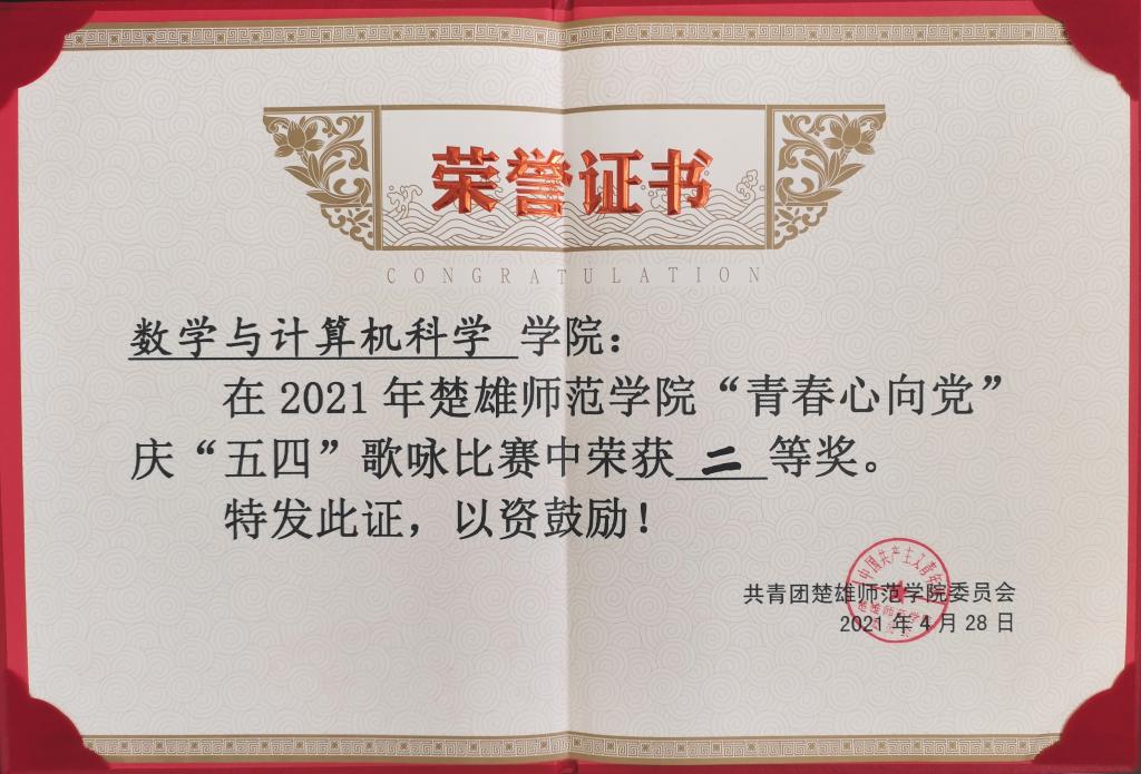 【荣誉展示】数学与计算机科学学院2021年集体荣誉展示(庆“五四”歌咏比赛)