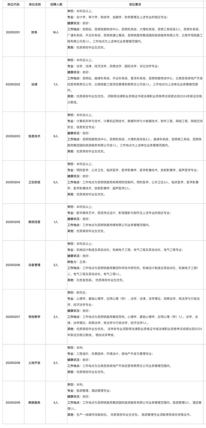 5.素质能力适应招聘岗位工作要求,服从企业对岗位、工作地点的安排和调整,商旅服务(代码:20250209)岗位新录用毕业生安排在中国铁路昆明局集团有限公司所属单位生产一线操作技能岗位。