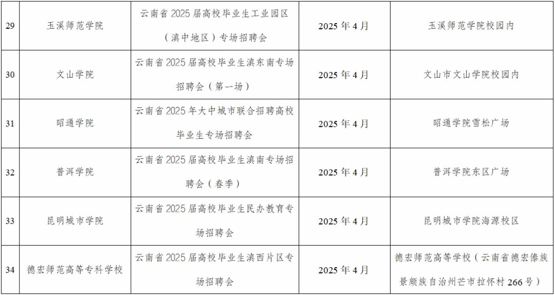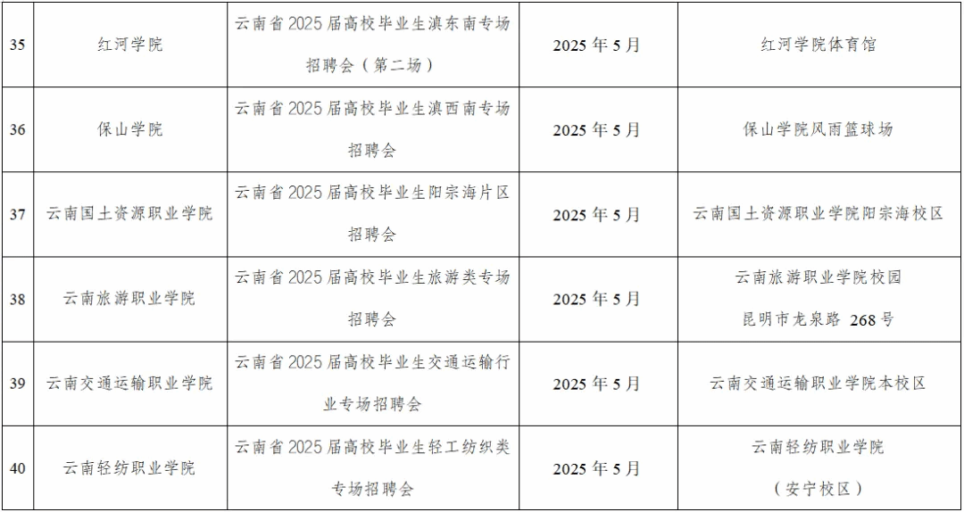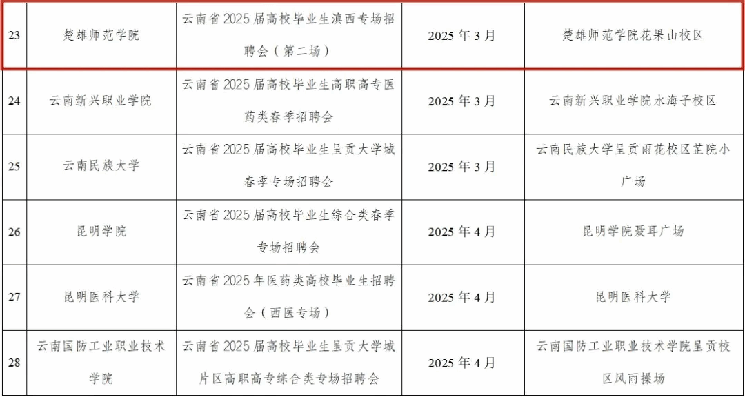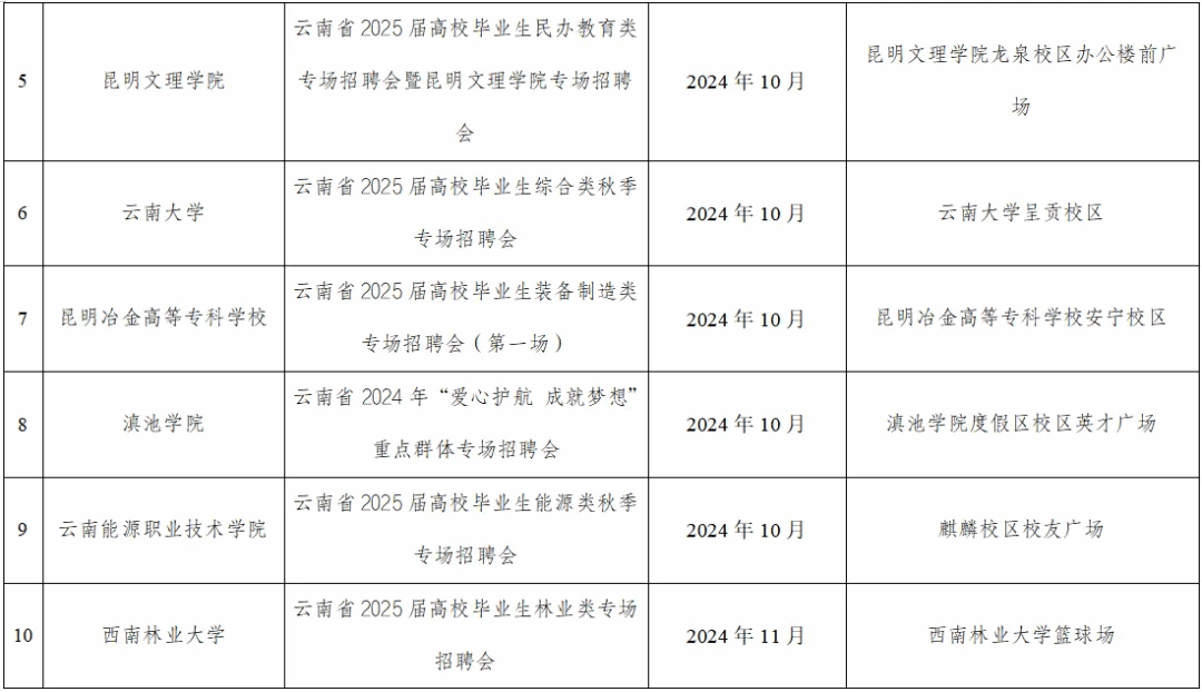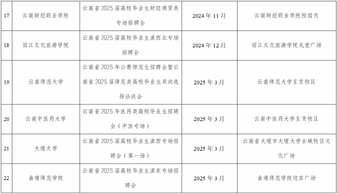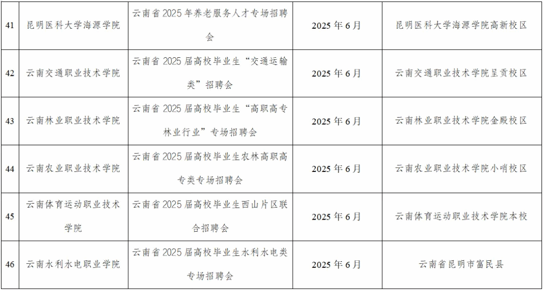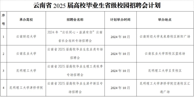 为做好云南省2025届高校毕业生就业工作,搭建毕业生和用人单位供需对接平台。近日,省委教育工委、省教育厅发文公布了云南省2025届高校毕业生省级校园招聘会的举办计划,计划举办不同片区、行业和专业的省级校园专场招聘会46场,详情如下: