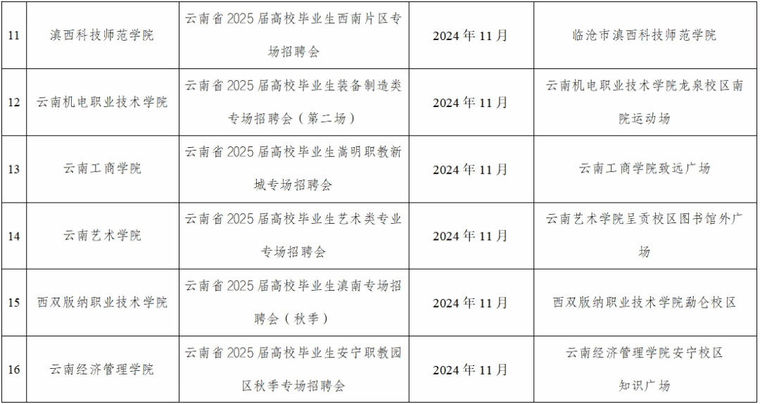 各场招聘会的具体举办时间、报名方式和参会要求都将在举办前至少2周,在云南高校毕业生智慧就业平台、承办高校就业信息网发布,有招聘需求的用人单位和毕业生可关注报名。